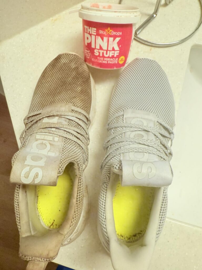 If your sneakers or shoes have turned dull or stained from everyday wear, The Pink Stuff can help.